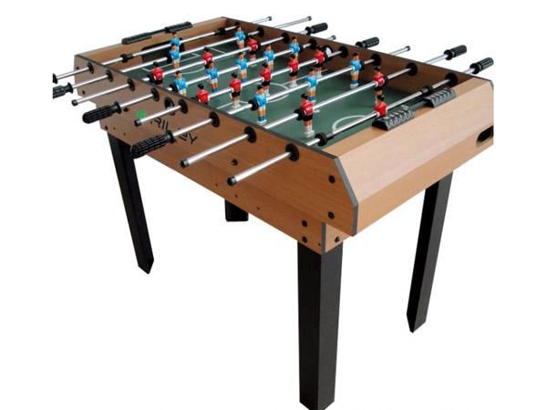 El futbolí també s'ajusta a la taula mitjançant les ranures. Té barres de metall sòlid amb agafadors i porta jugadors de plàstic amb les cames juntes, en formació 1-2-5-3. Inclou dues boles i marcadors a sobre de les porteries.