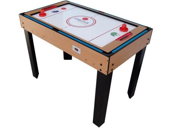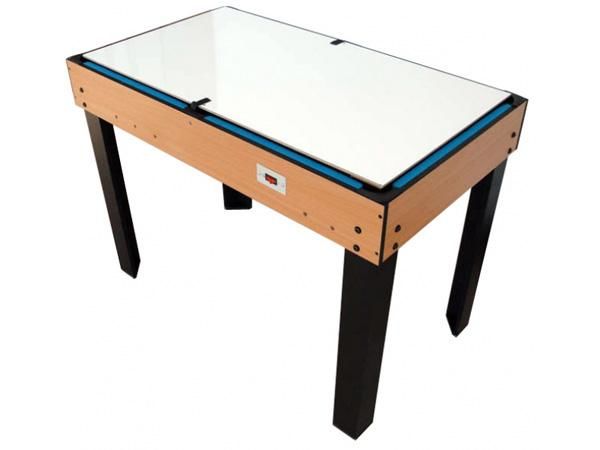 La taula d'air hockey necessita estar connectada a la corrent, perquè inclou un ventilador de 240 V que en passar l'aire pels forats habilitats permet el joc ràpid i suau. S'ajusta a la taula mitjançant ranures. Inclou 2 pucks o discs, 2 marcadors i 2 polsadors.
