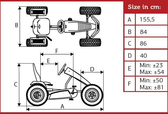 - Els karts de pedals BERG JEEP REVOLUTION BFR a més del sistema de fre contrapedal tenen una palanca de fre per ser accionada amb la mà. És un fre que no és necessari per a la seguretat del kart però que és divertit derrapar accionant el fre de mà. Per aquest motiu els karts de pedals BERG d'aquesta mida tenen aquest doble sistema de frenada.