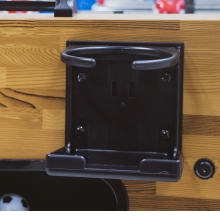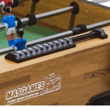 Posagots plegable. El futbolí de la marca Masgames té un posagots plegable a cada costat. S'hi pot posar un got o una ampolleta. És bo hidratar-se quan s'està jugant a un esport d'interior com aquest.