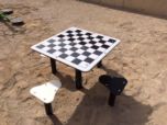 Taula de joc Escacs resistent per exterior i amb quatre seients. Aquesta taula de joc està homologada per a ús públic.