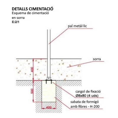 Esquema de com són els ancoratges per a un terra de sorra. S’han de fer daus de formigó i després deixar 40 cm de sorra no compactada. Cal passar-hi un rasclet periòdicament per descompactar la sorra.