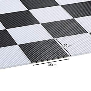 Les mides del tauler rígid per als escacs gegants. El tauler medeix 2,8 x 2,8 m. Cada quadrat té unes mides de 35 x 35 cm i una alçada de 0,5 cm. Mides caixa: 38,5 x 38,5 x 35,5 cm. El tauler té un pes de 9,75 kg.